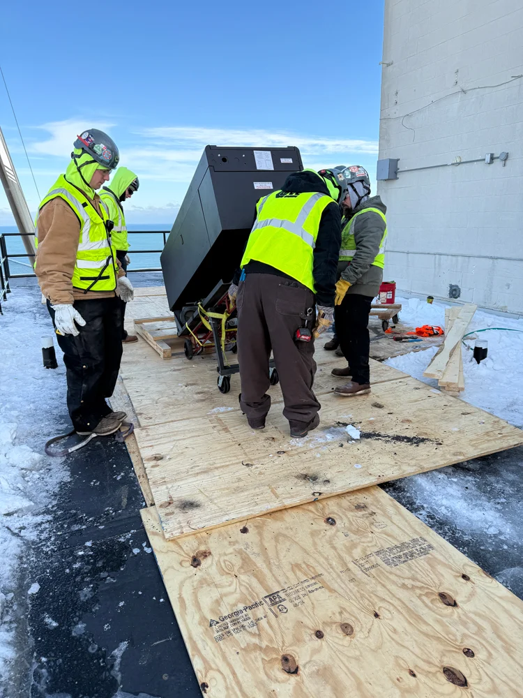 Hydro Flo representative Charlie Meier was present during the crane picks to ensure proper handling of the boilers, protect warranty requirements, and provide on-site support to the installation crew.