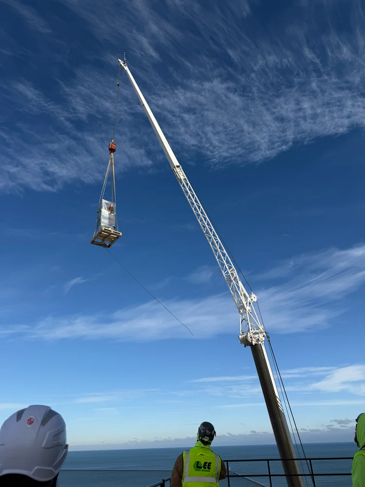 One of the primary challenges was material handling. The original plan required transporting equipment from ground level through elevators to the 25th floor and then up a stairwell to the penthouse. To improve efficiency and reduce labor, the Lee Mechanical team revised the approach and set a 275-ton crane.